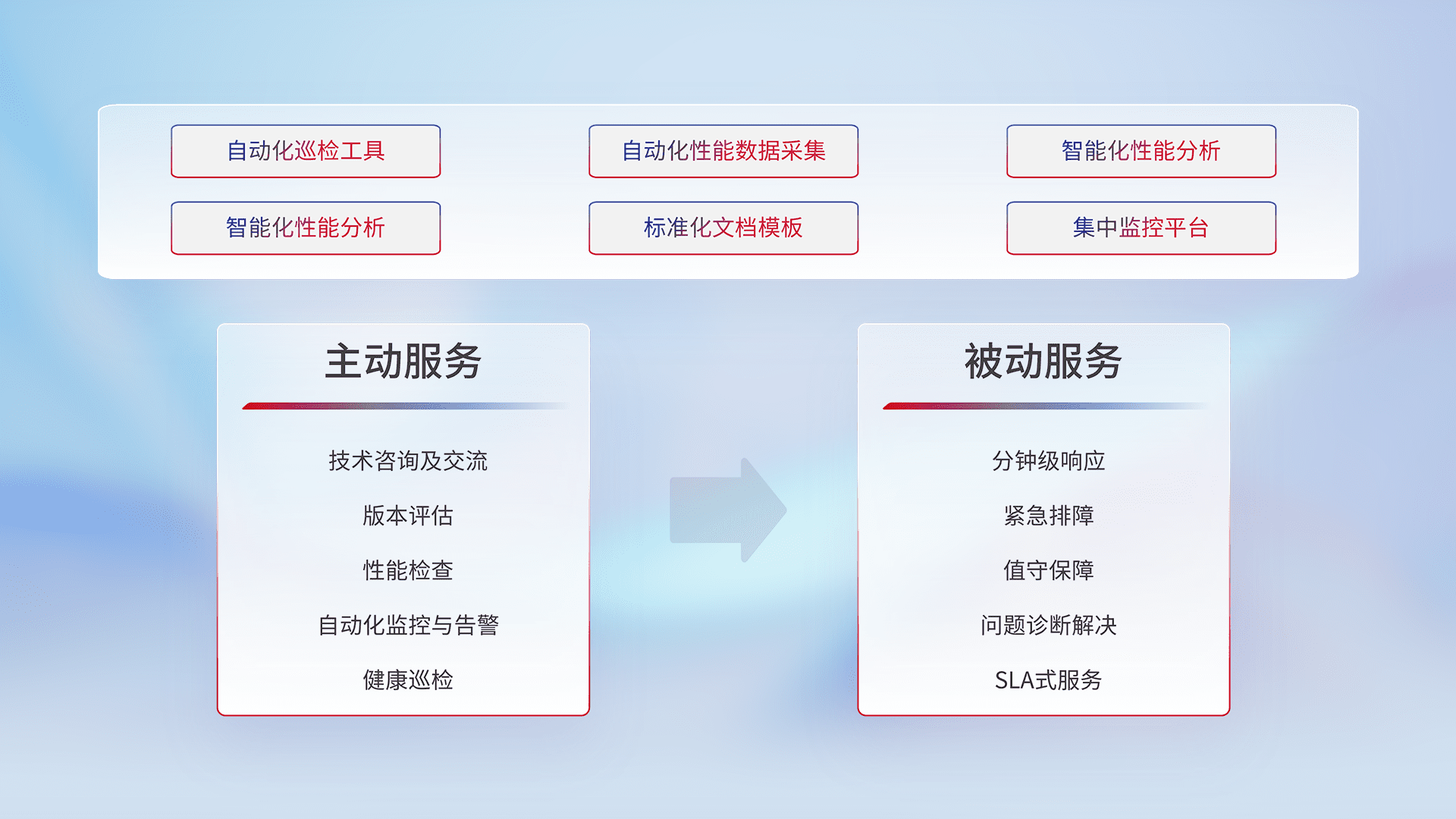 智能化工具和标准化文档,,,保障服务质量,,,,提供主动服务(包含技术咨询、、版本评估、、性能检查、、、自动化监控与告警、、、健康巡检)和被动服务包含(分钟级响应、、、紧急排障、、值守保障、、、、问题诊断解决、、、、SLA服务)。。